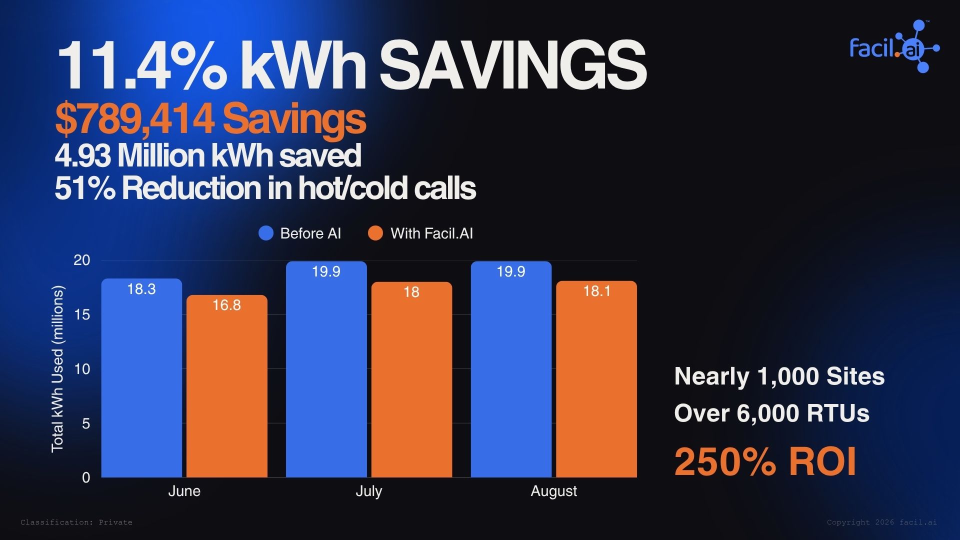Results: 11.4% kWh reduction | $789,414 saved in 90 days | 51% Reduction in hot/cold calls