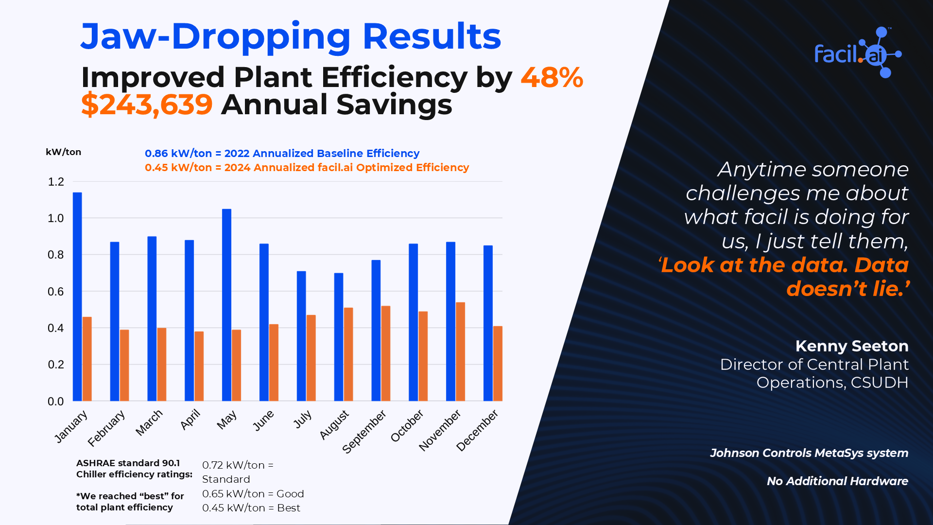 "Anytime someone challenges me about what Facil.AI is doing for us, I just tell them, 'Look at the data. Data doesn't lie.'" -- Kenny Seeton, Director of Central Plant Operations, CSUDH